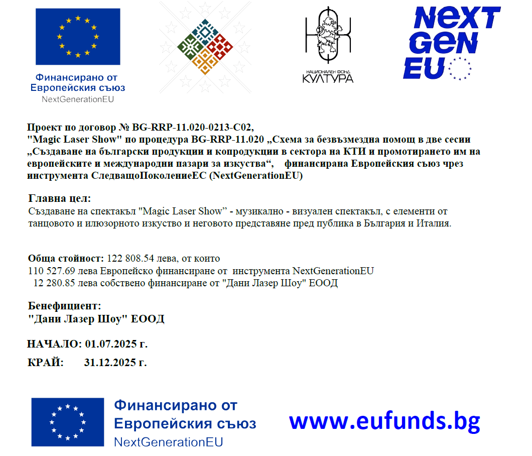Радваме се да Ви съобщим, че "Дани Лазер Шоу" ЕООД подписа договор с "Национален Фонд Култура" по проект № BG-RRP-11.020-0213 с наименование „Меджик Лазер Шоу" по процедура № BG-RRP-11.020 - „Създаване на български продукции и копродукции в сектора на КТИ и промотирането им на европейските и международни пазари за изкуства“, от Плана за възстановяване и устойчивост, финансирана Европейския съюз чрез инструмента "Следващо Поколение ЕС" - "NextGeneration" EU". Представленията ще бъдат на 25 юли в Самоков в рамките на традиционния фестивал "Лаго Фест" и на 2 август в Перник, в рамките на традиционния фестивал "Празник на Мошино". На 19 септември ще представим нашето шоу в Италия, град Гуалдо Тадино, в театър "Дон Боско".
